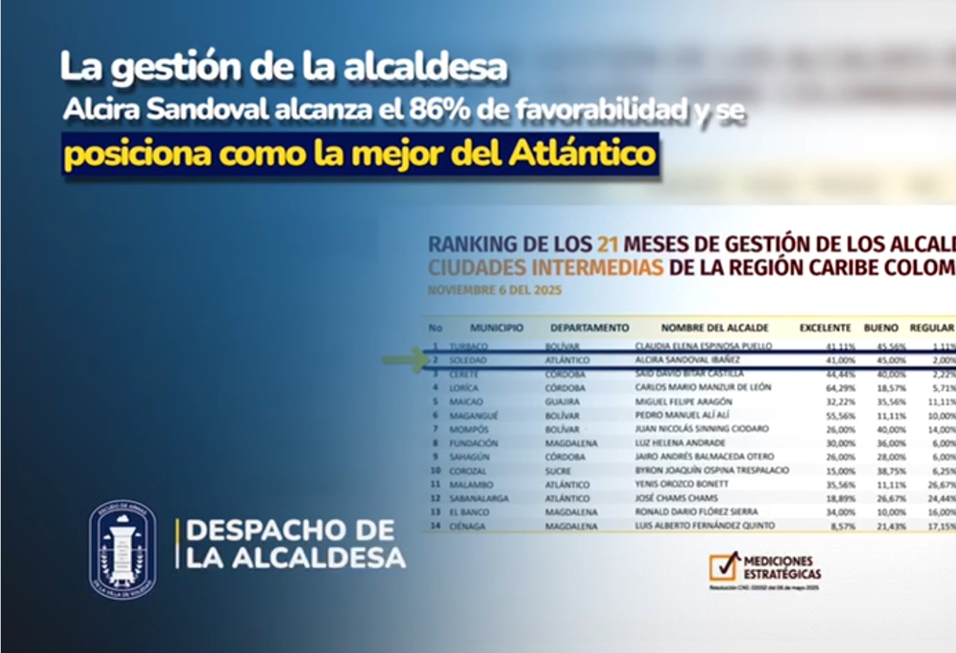 Con un 86% de aprobación, Alcira Sandoval, la alcaldesa mejor valorada del Atlántico y la segunda de la región Caribe