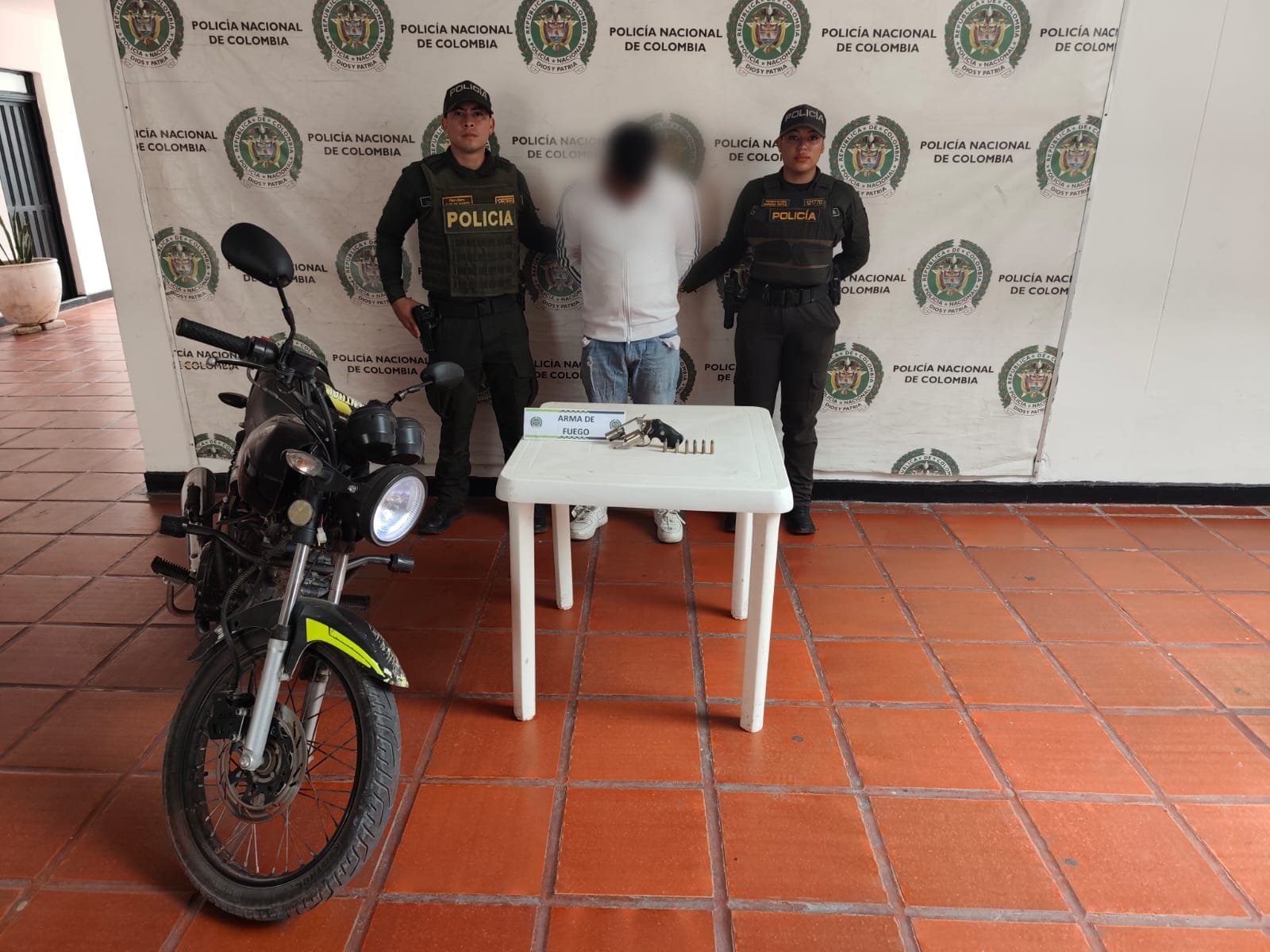 El procedimiento se llevó a cabo en momentos en que uniformados observaron a una persona que se movilizaba en una motocicleta, quien presuntamente se encontraba señalando un establecimiento de comercio, situación que generó sospecha inmediata. Gracias a la rápida reacción policial, el sujeto fue interceptado, hallándole en su poder un arma de fuego de fabricación industrial tipo revólver calibre 38 mm, junto con seis cartuchos del mismo calibre.