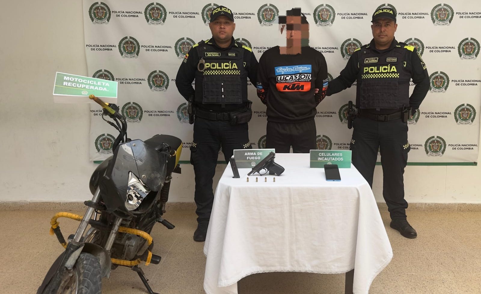 Los hechos se registraron en zona rural de este municipio, en un sector conocido como Múcura, cuando uniformados de la Patrulla de Vigilancia sorprendieron en flagrancia a dos individuos mientras intimidaban con arma de fuego a un ciudadano para despojarlo de su motocicleta.