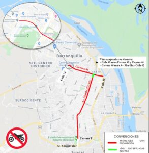 La circulación y/o tránsito de motocicletas, motociclos, mototriciclos y motocarros en Barranquilla queda restringida todos los días de la semana entre las 11:00 p.m. y 5:00 a.m. del día siguiente. Se exceptúa de la restricción los casos en que la motocicleta sea conducida por su propietario, quien deberá presentar la licencia de tránsito ante la autoridad y puede llevar acompañante siempre y cuando esté inscrito.
