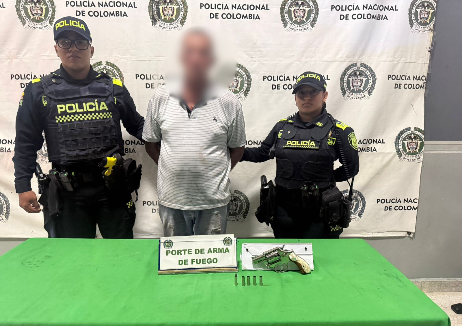 Durante el procedimiento fue incautado un revólver de fabricación industrial calibre 38 Special, con cartuchos en su interior, varios de ellos percutidos, sin que el capturado pudiera presentar documentación que acreditara su legal tenencia o porte. El ciudadano fue dejado a disposición de la autoridad competente.