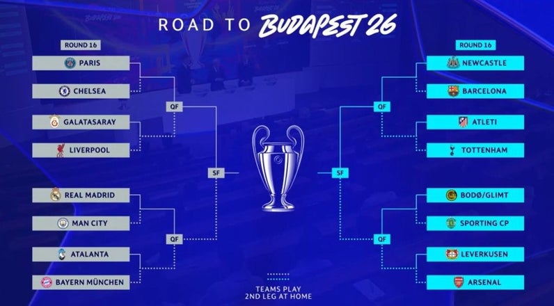 El resto de emparejamientos también ofrece atractivos particulares: Galatasaray se medirá ante el Liverpool; Atalanta enfrentará al Bayern Múnich; Newcastle United jugará contra el FC Barcelona; el Atlético de Madrid chocará con el Tottenham Hotspur; Bodø/Glimt tendrá como rival al Sporting Lisboa; y el Bayer Leverkusen se verá las caras con el Arsenal.