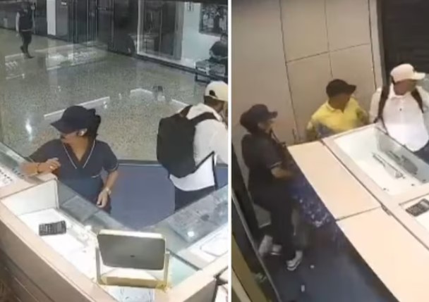 En cuestión de segundos, otro hombre apareció y permaneció en la entrada antes de ingresar. Poco después, un cuarto individuo, vestido con una camisa amarilla y llevando una bolsa, entró al establecimiento. A medida que la joyería se llenaba, una tercera empleada salió brevemente; fue entonces cuando los asaltantes sacaron sus armas y amenazaron a las trabajadoras.